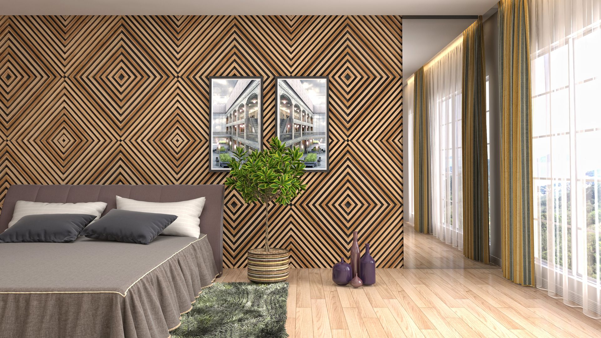 Vertical flutes behind the sofa or bed for height enhancement