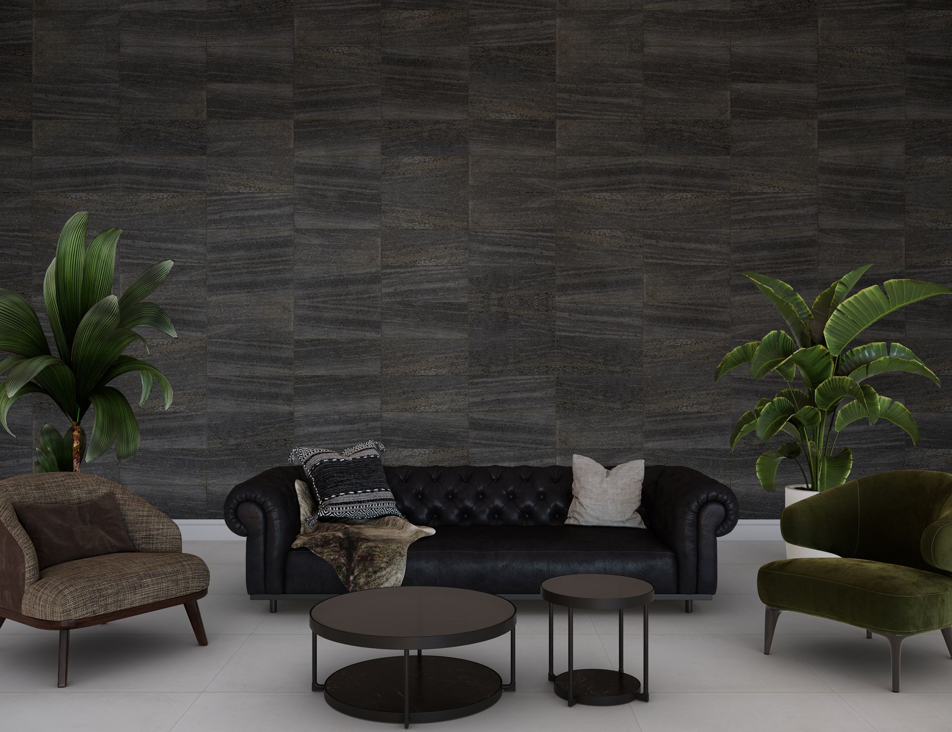Soft lighting enhances textures and highlights the depth of fluted, 3D, and charcoal panels.